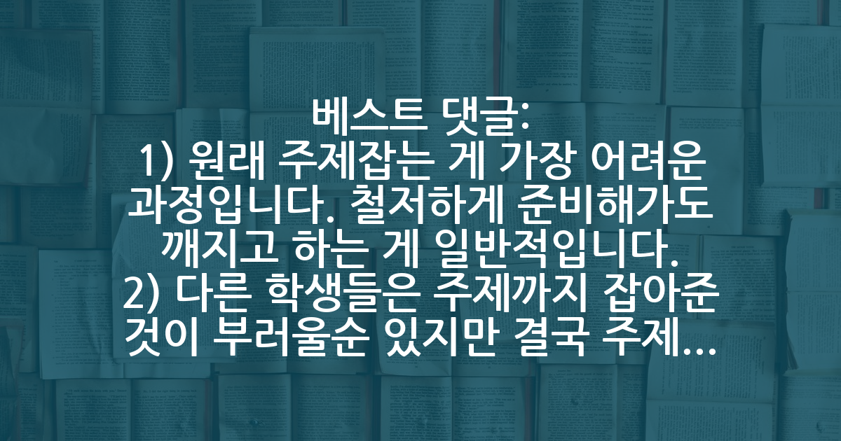 BEST1) 원래 주제잡는 게 가장 어려운 과정입니다. 철저하게 준비해가도 깨지고 하는 게 일반적입니다. 2) 다른 학생들은 주제까지 잡아준 것이 부러울순 있지만 결국 주제는 본인이 잡아야 하는 것이 맞습니다. 그냥 그 학생들은 운이 좋았구나 하고 넘기시길 바랍니다. 3) 흔히 학계의 사람들은 공부를 많이 한 사람들이니 점잖고 논리적인 사람들이라 오해하기 쉽지만 반대입니다. 대부분은 무조건 자기 말이 맞다고 우기는 편협적인 사람들입니다. 그럼에도 불구하고 그런 사람들을 설득시켜야 학회 혹은 저널에 논문이 게재될 수 있습니다. 학위과정은 이를 배우는 과정이라고 생각하시는 편이 더 좋지 않을까 싶습니다.