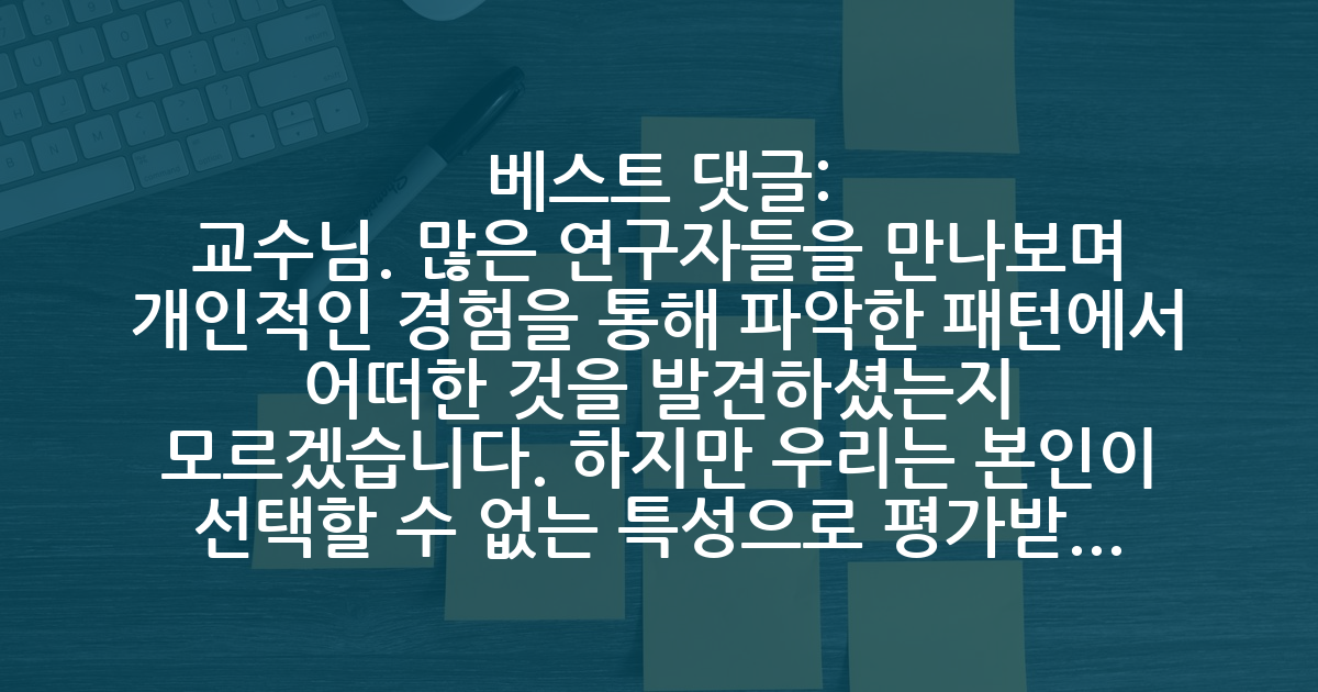 BEST교수님. 많은 연구자들을 만나보며 개인적인 경험을 통해 파악한 패턴에서 어떠한 것을 발견하셨는지 모르겠습니다. 하지만 우리는 본인이 선택할 수 없는 특성으로 평가받지 않아야 한다고 믿습니다. 국적, 인종, 종교에 성별도 포함이겠죠. 말씀을 들어보니 여러 연구자들로부터 존경받는 자리에서 학계의 다양한 계층의 인원에게 영향력을 행사할 능력이 있으신 것 같습니다. 교수님께서 개인적으로 여성 연구자에 대한 어떠한 인식이 있다 하시더라도, 그것을 공공연하게 드러내시면 주위 사람들이 그에 반응하게 될 듯합니다. 본인의 자리에서 최선을 다하고 있는 여성 연구자들은 상처를 받을 것이고, 연구자를 꿈꾸는 예비 여성 학생들은 낙담할 것이고, 어떤 사람들은 본인이 스스로 경험해보지도 않은 상태에서 여성 연구자에 대한 편협한 편견을 가지게 될지 모르겠습니다. 저는 여성 연구자가 남성 연구자에 비해 어떠하다, 혹은 차이가 없다를 주제넘게 말하고 싶지 않습니다만, 설령 어떠한 특성이 있더라도 이렇게 공공연하게 발화하시는 것에는 득보다 실이 많지 않나 생각됩니다. 여기는 익명 게시판일 뿐이지만 그렇기 때문에 오히려 개인의 사견이 빠르게 퍼지기도 합니다. 교수님께서는 평소 느낀 바를 허심탄회하게 말씀하신 것일지 모르겠지만 의도치 않은 큰 영향이 미칠지 모름을 한번 더 재고해주시면 좋겠습니다.